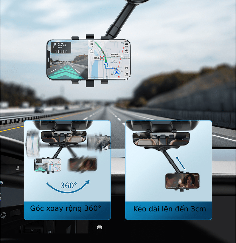 Giá đỡ kẹp điện thoại lên gương chiếu hậu để trên xe hơi ô tô xoay 360 độ chống rung treo đa điểm